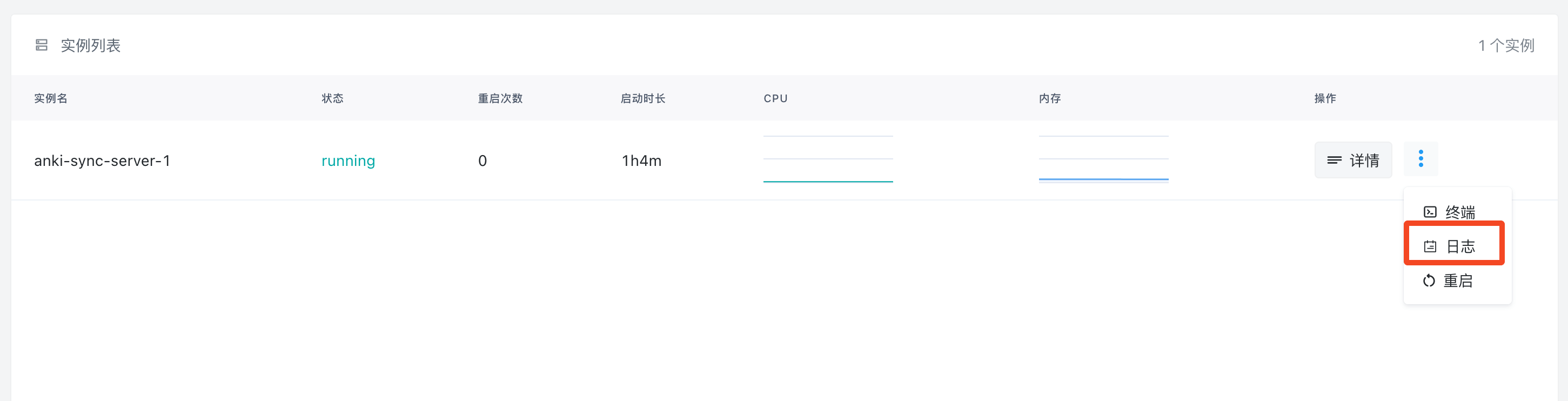 Viewing logs is also straightforward - click the "three dots" on the instance panel and select "Logs":