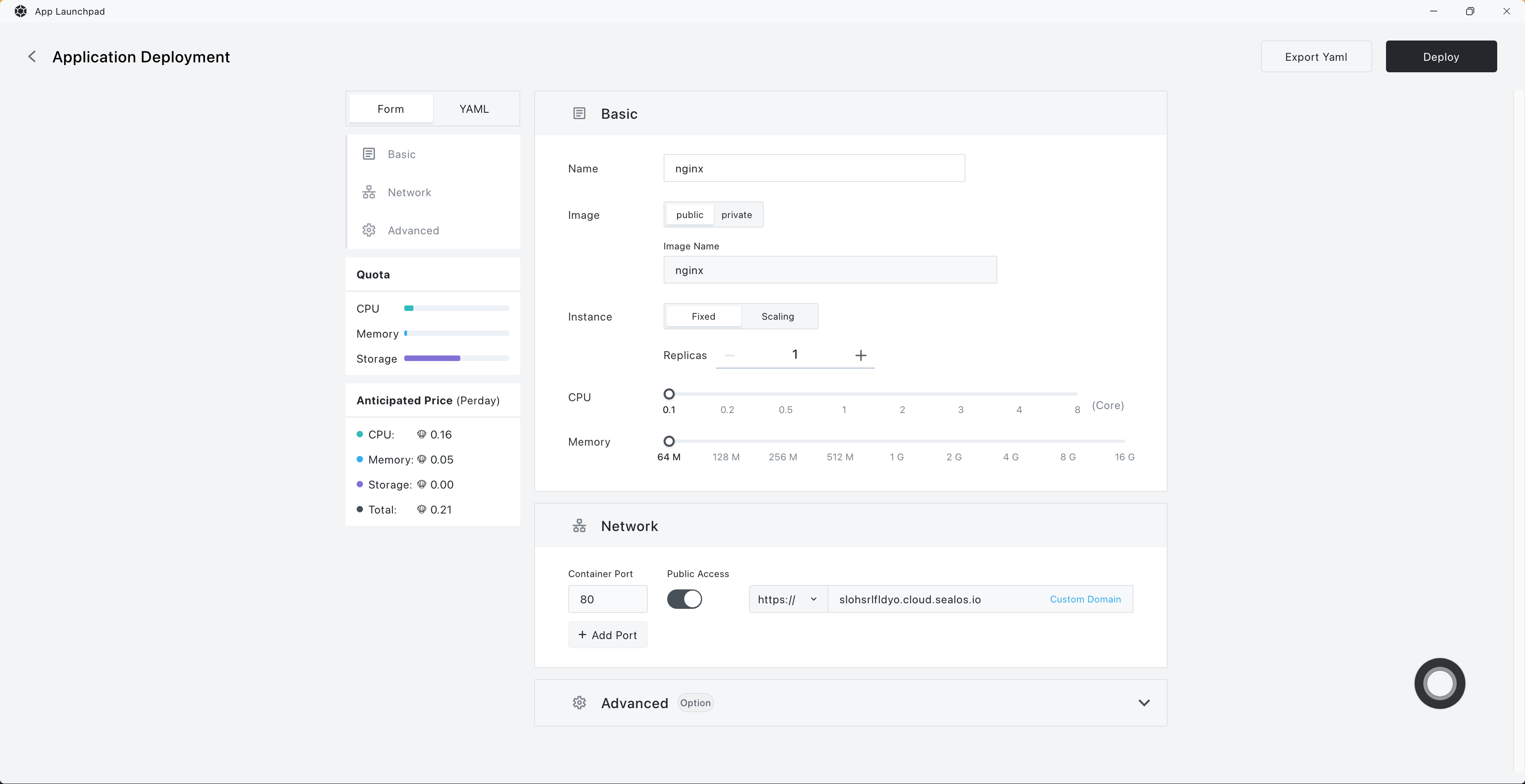 Enter the application name and image name in sequence, enable external network access, and then click "Deploy Application" to proceed.