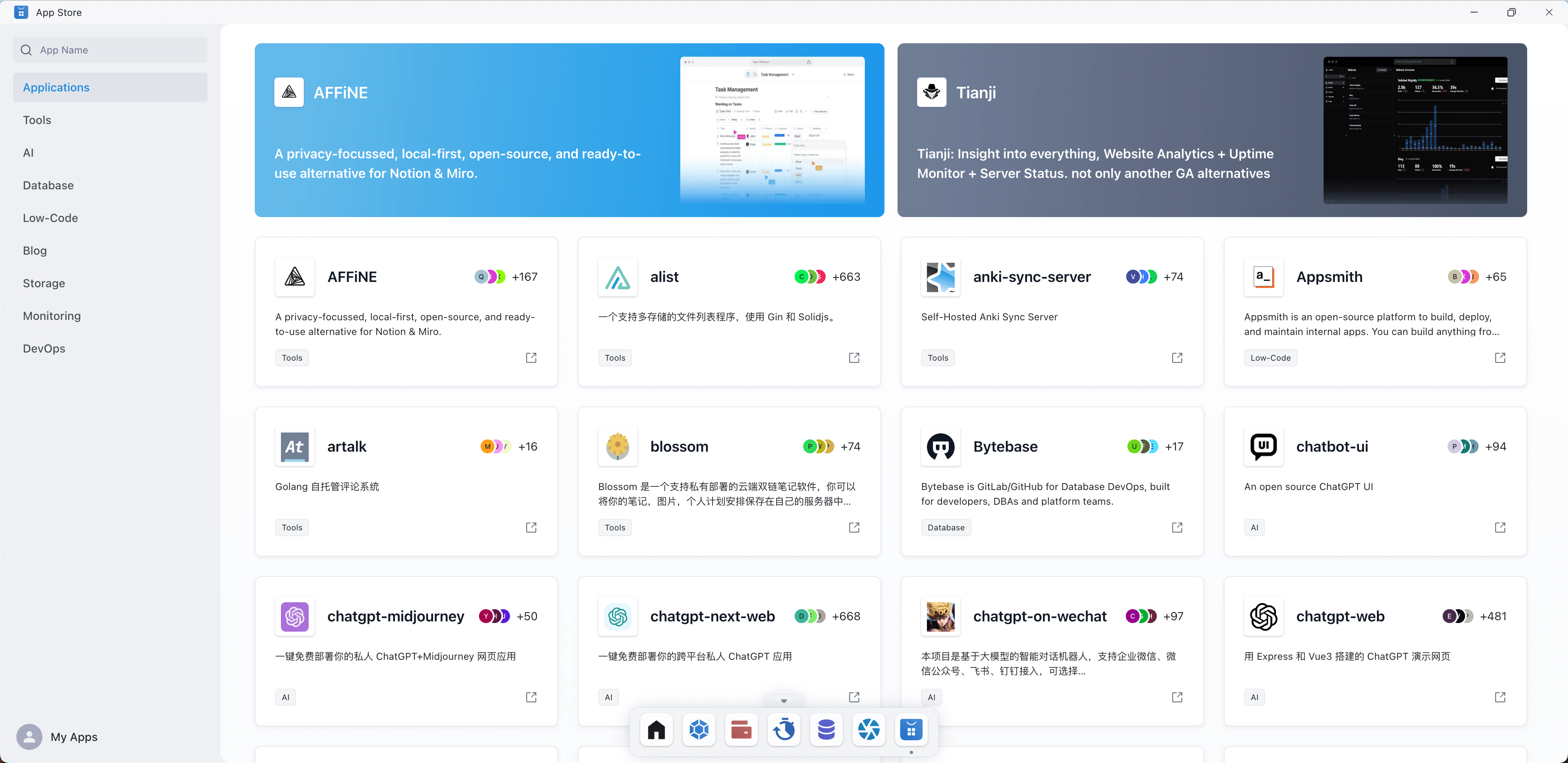 The App Store provides a series of pre-made application templates to support the rapid creation and deployment of various websites and applications. These templates include Blog applications, AI Applications, low-code applications, storage applications, instant messaging applications, middleware, etc. are designed to simplify the development process so that developers do not need to build projects from scratch or deal with dependencies between applications.
