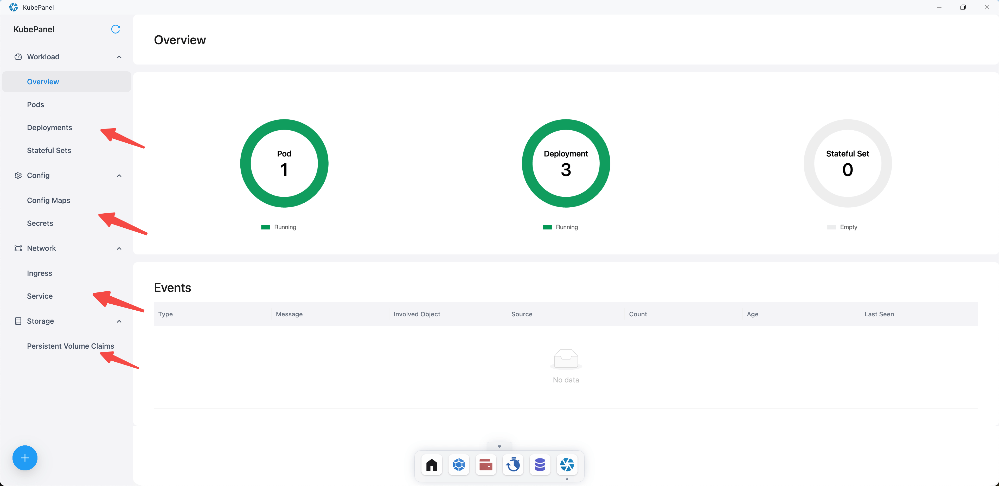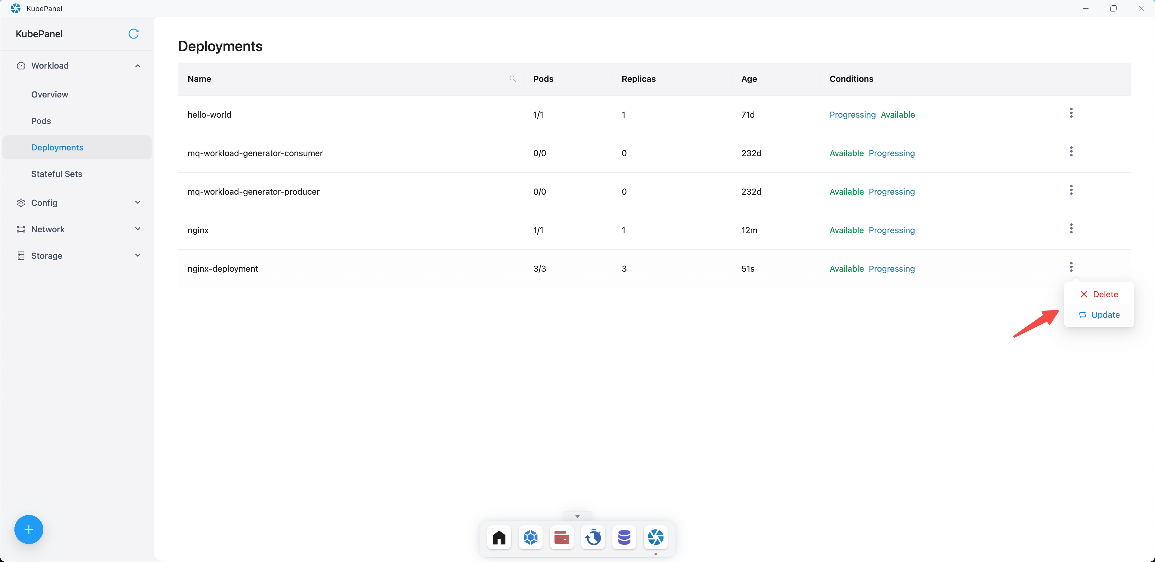 In Kubepanel, you can view Workload, Config, Network, and Storage resources.