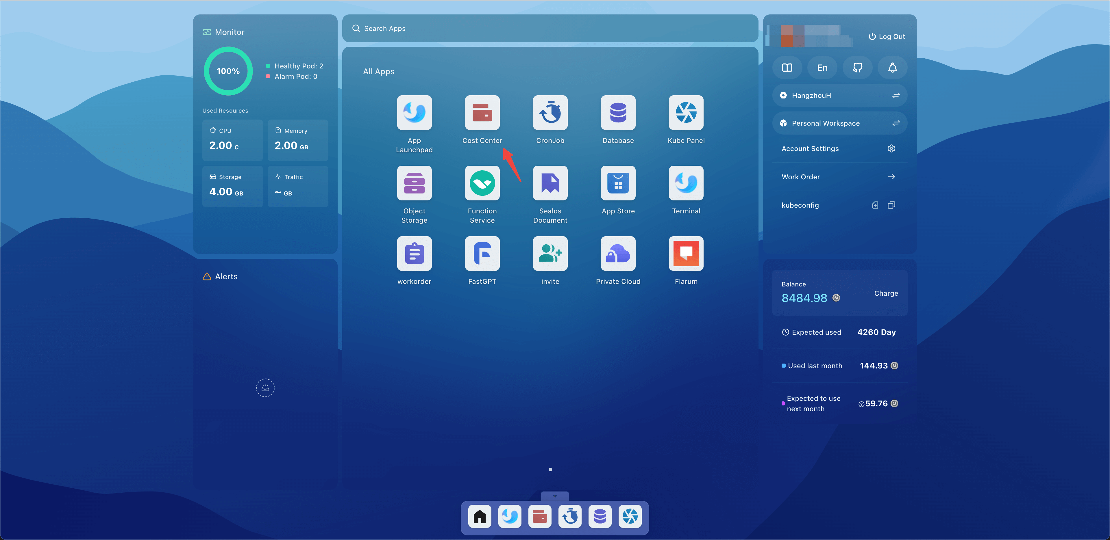 Open the Sealos desktop and click on the Cost Center.