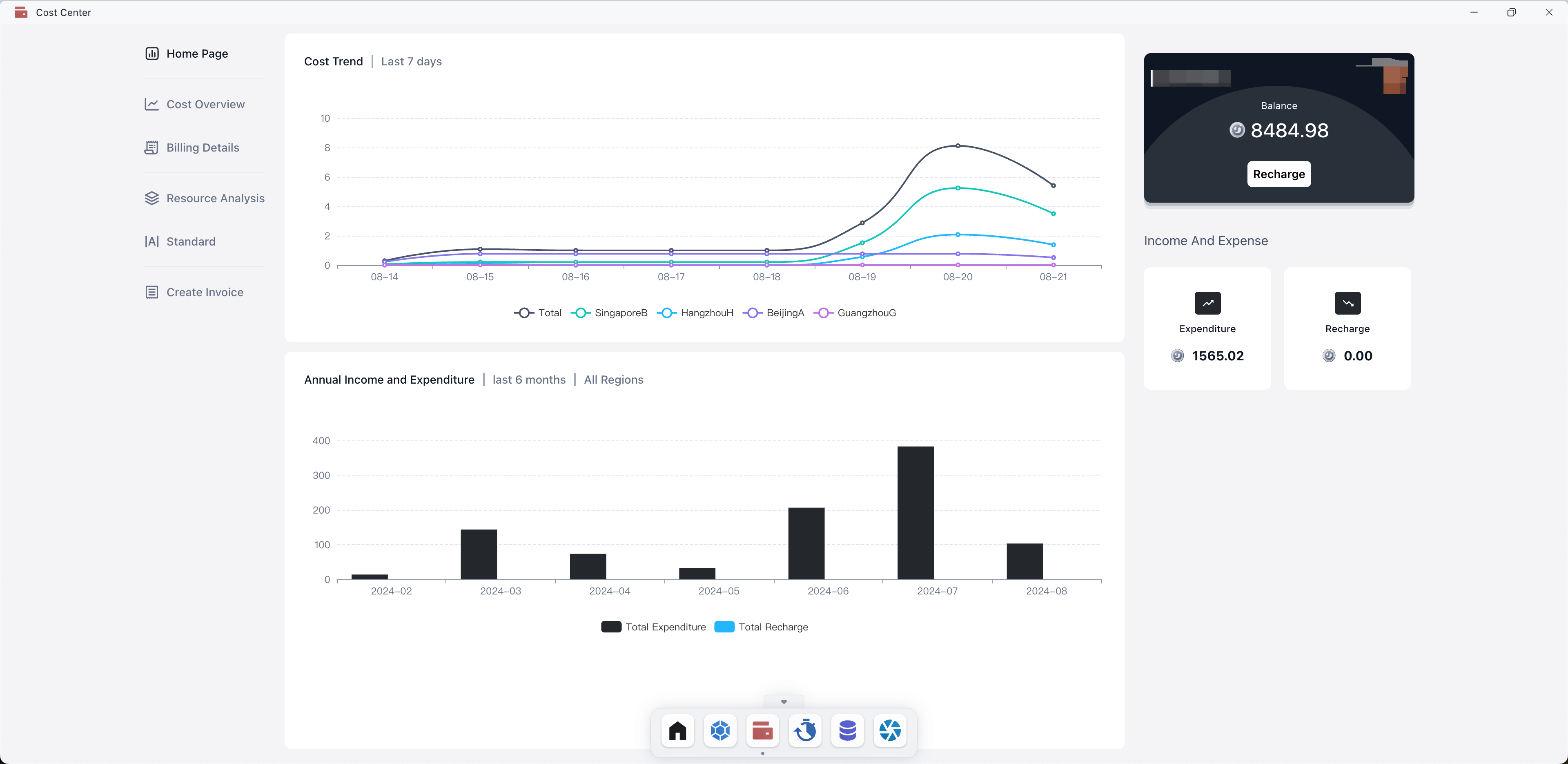 Cost Overview and Billing Details display the overall income and expenditure of the account and the expenses of various applications, Resource Analysis shows the expenditure distribution of each resource, Standard explains pricing information, and the Create Invoice module supports generating invoices for recharges.