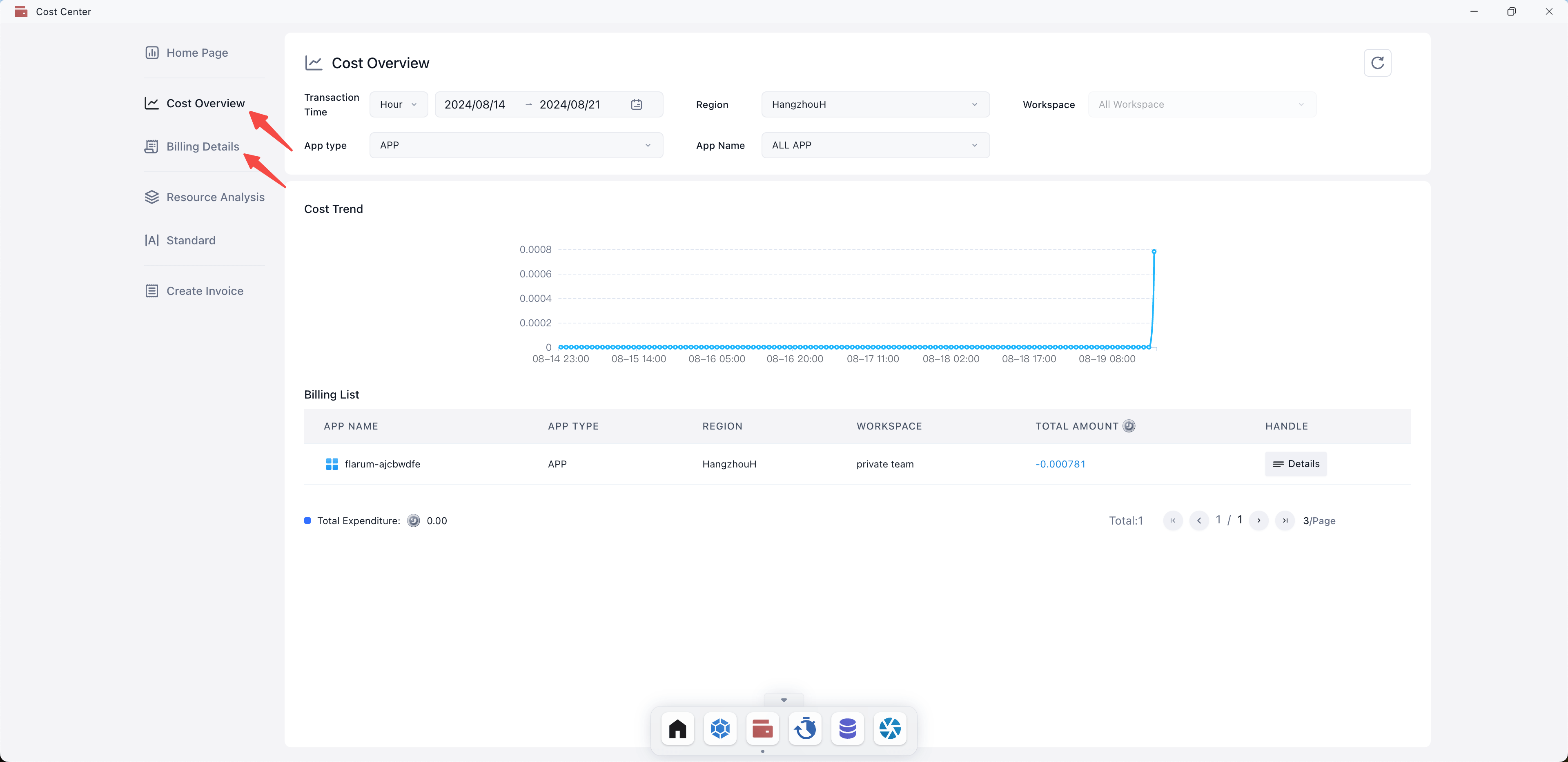 Supports quick bill lookup and filtering by setting time range, available zones, workspaces, application types, and application names.