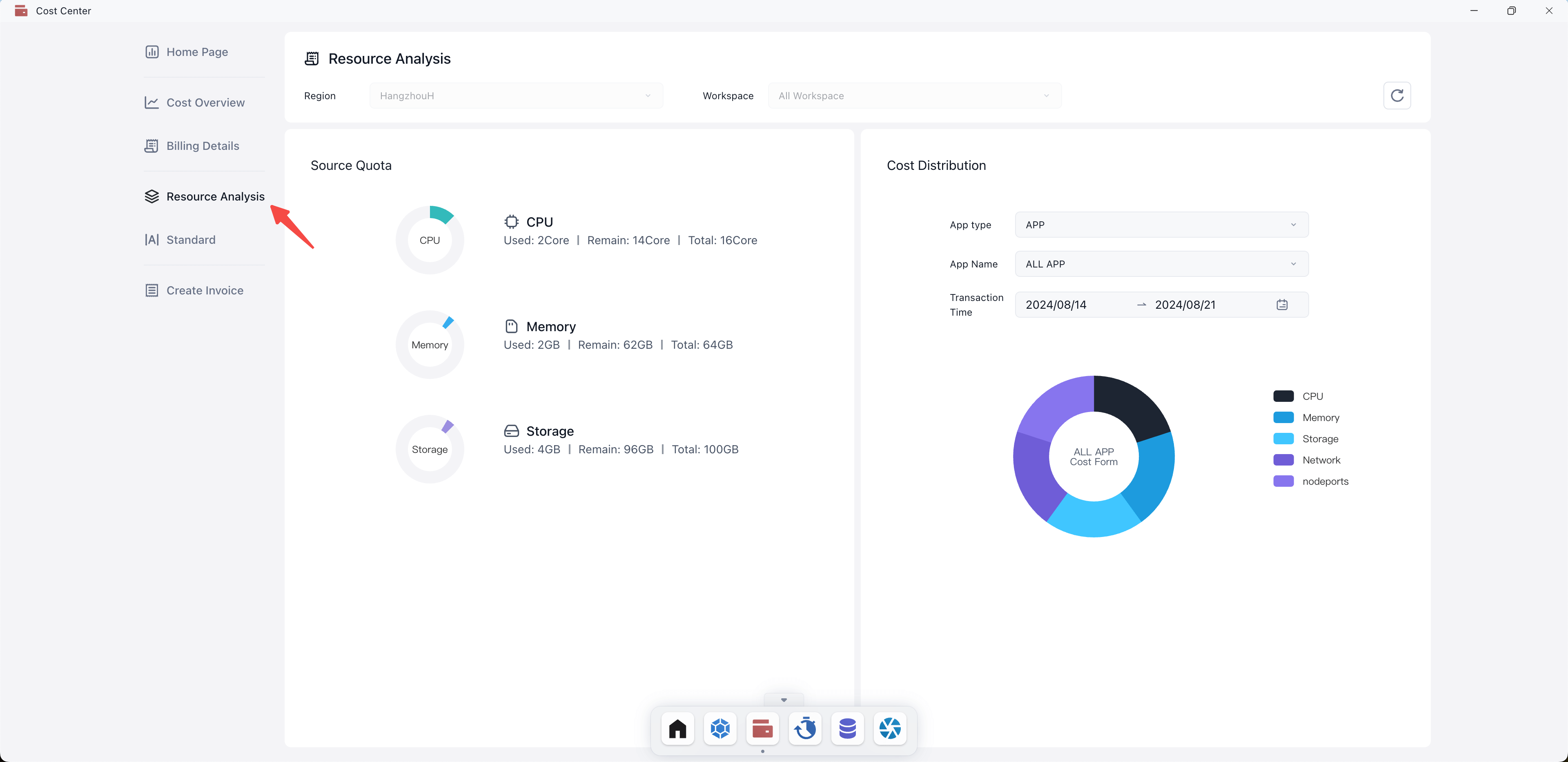 Shows resource quota and cost distribution charts, with filtering options by setting time range, available zones, workspaces, application types, and application names.