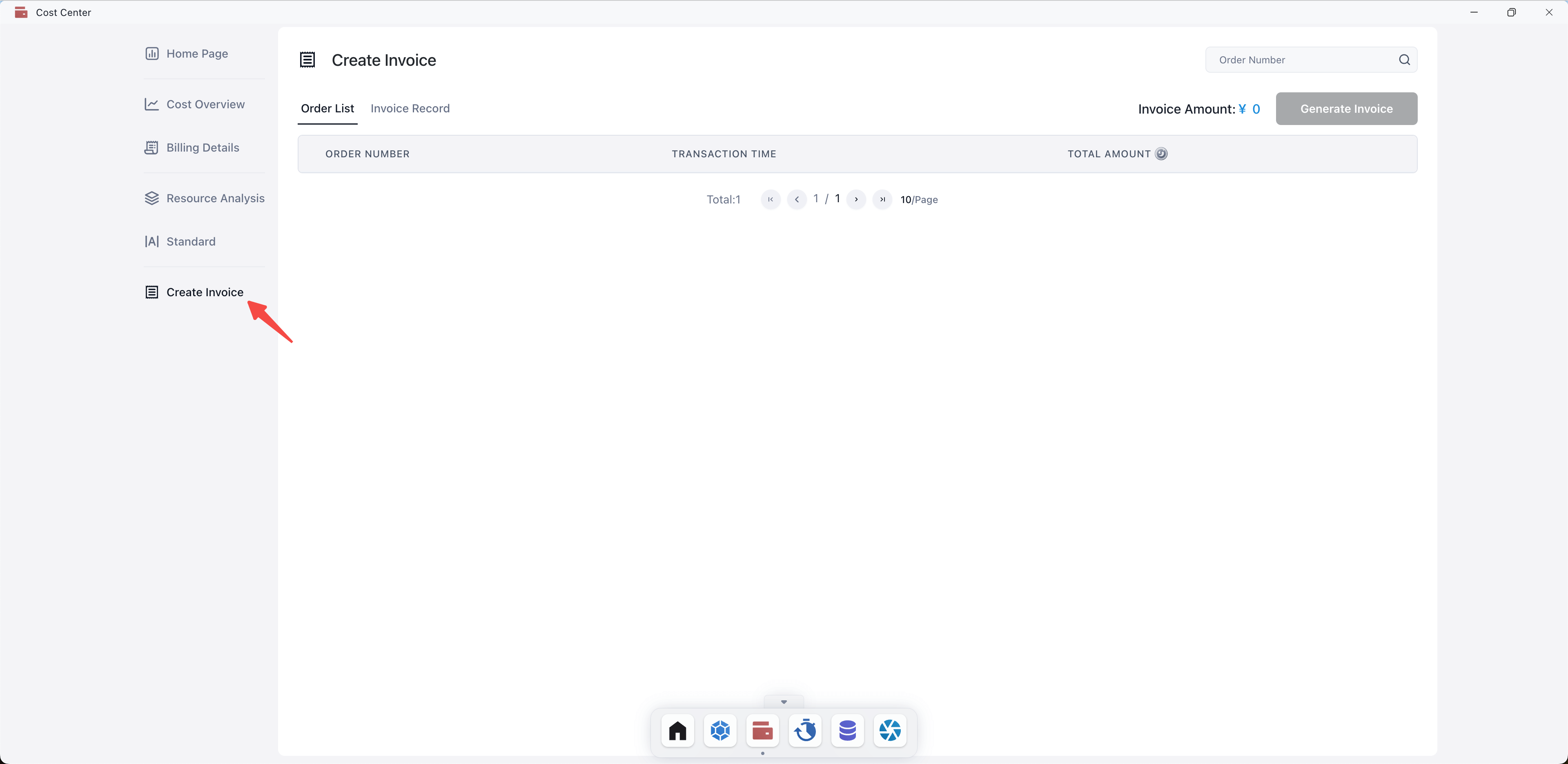 The Cost Center consists of five modules: Cost Overview, Billing Details, Resource Analysis, Standard, and Create Invoice.