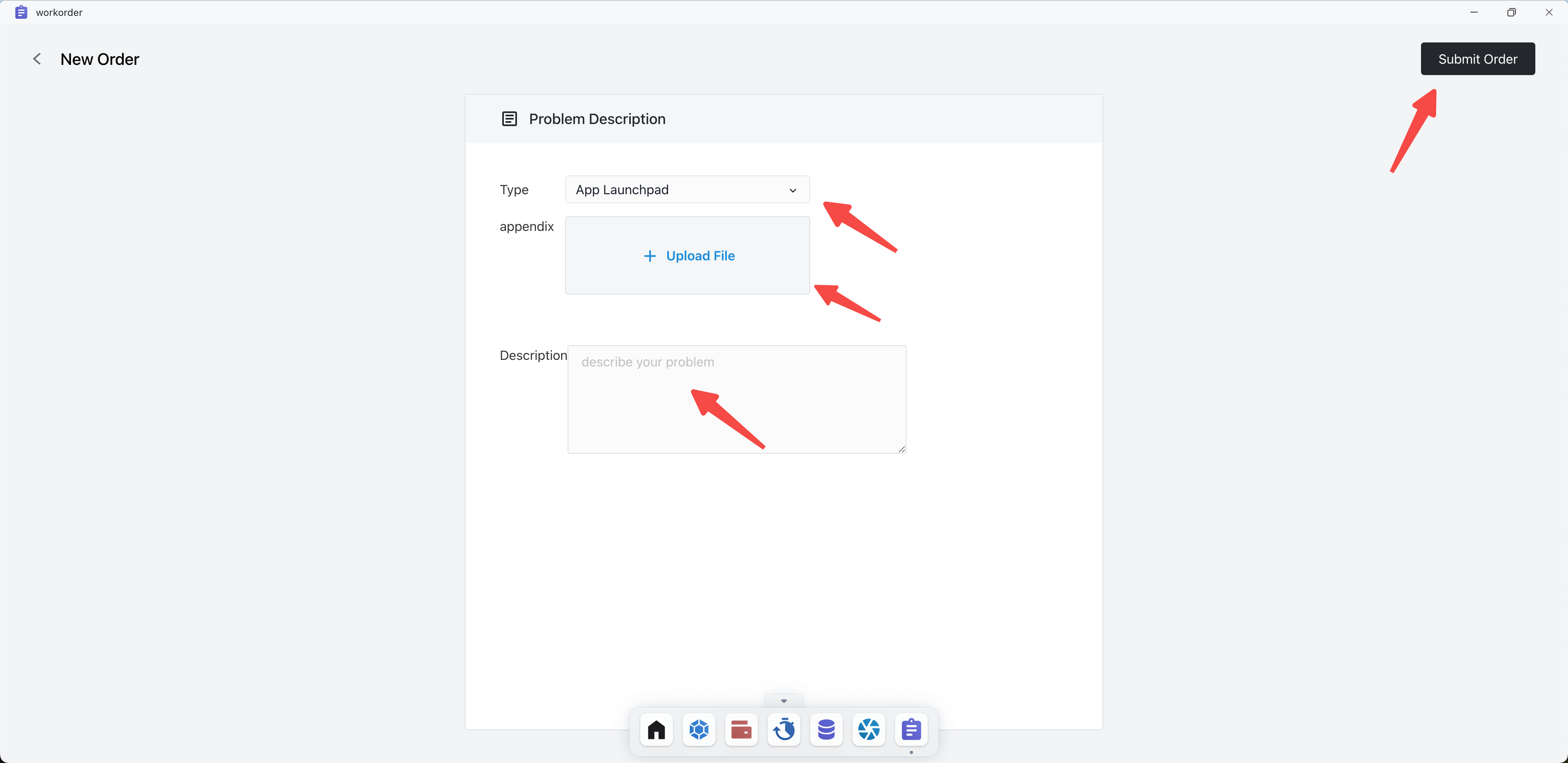 Select the type of issue, upload relevant appendix, describe the details of the issue, and then click Submit Order.