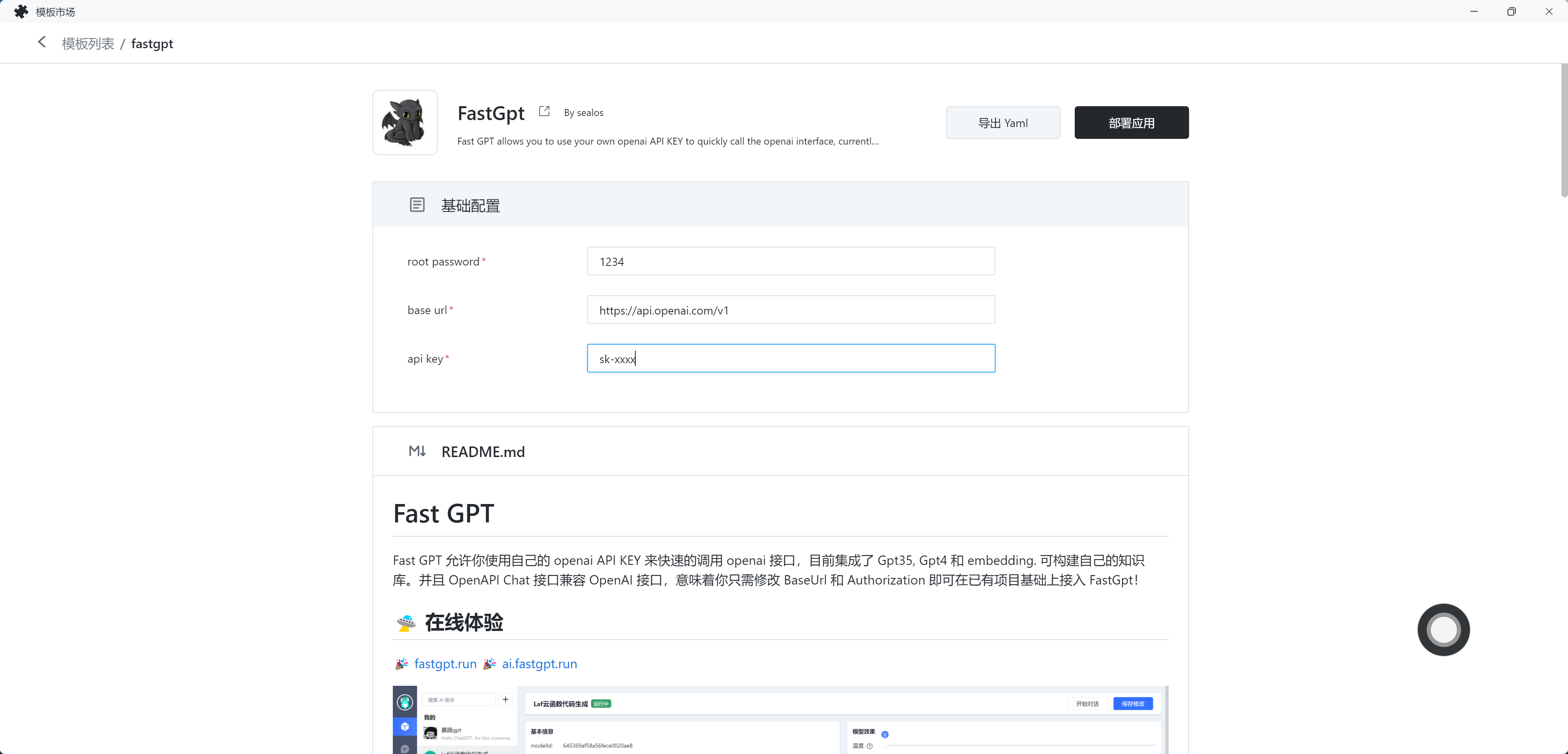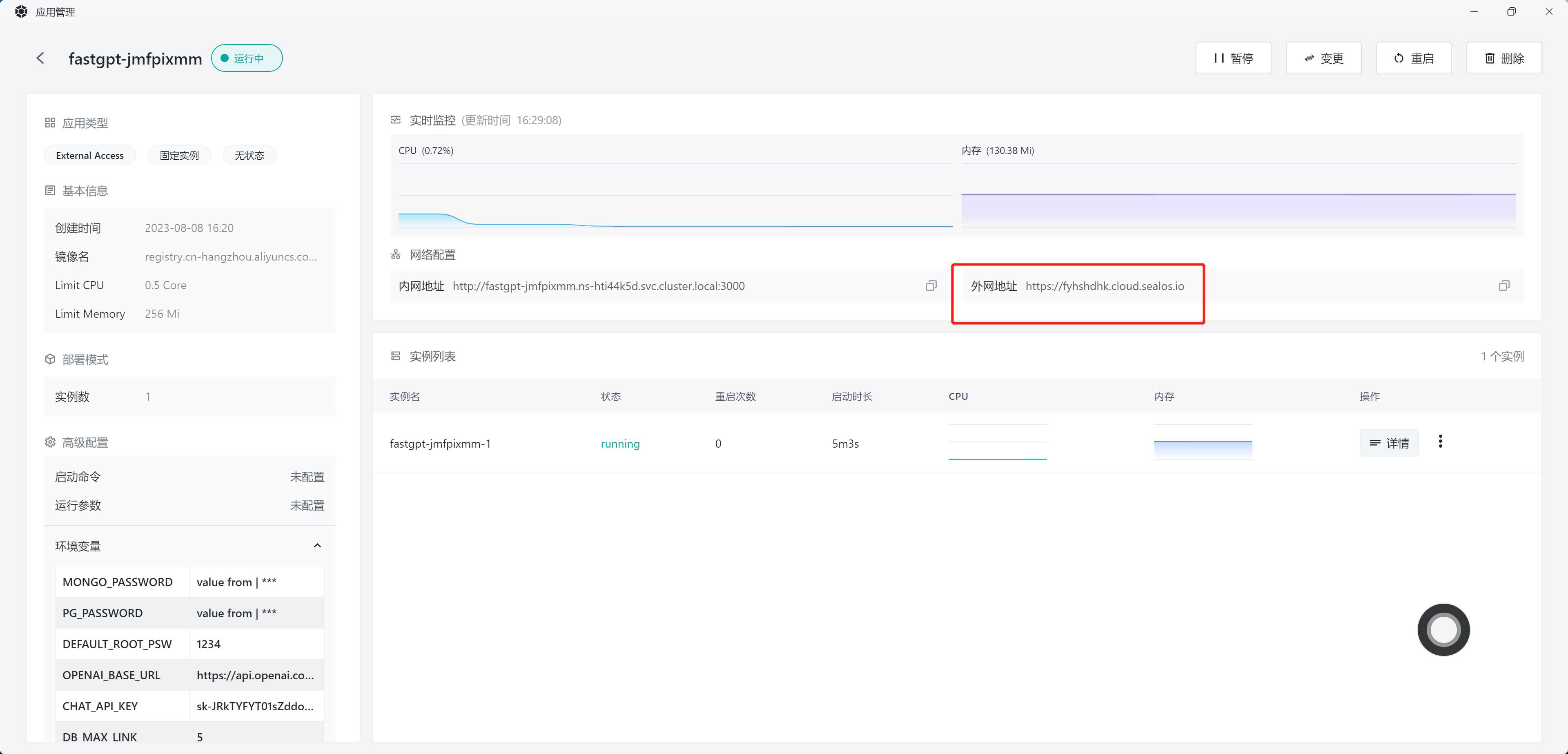 Click on the [external address] provided by sealos to use it. The login user name is root, and the password is the newly set environment variable (1234 in the figure above)