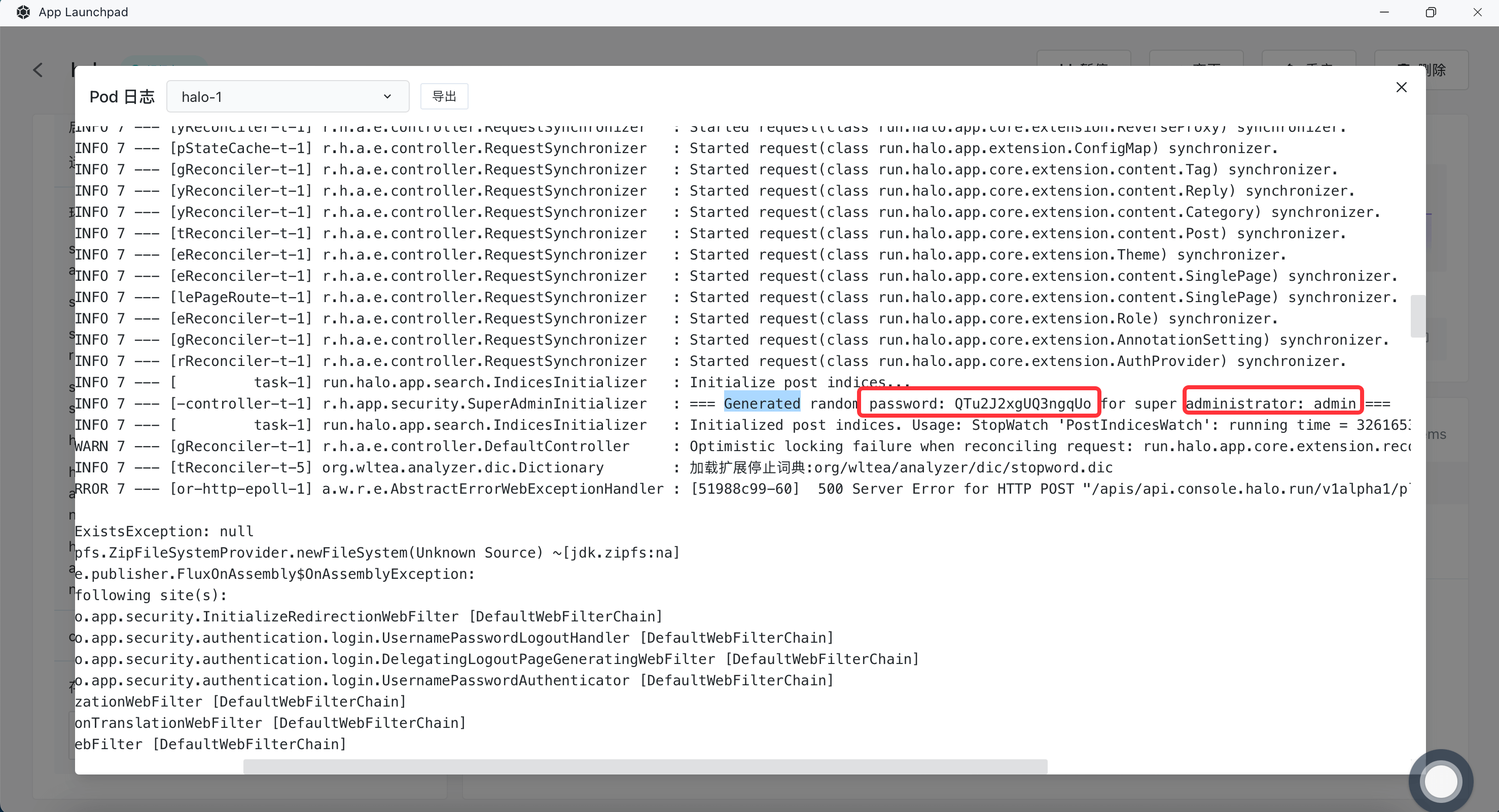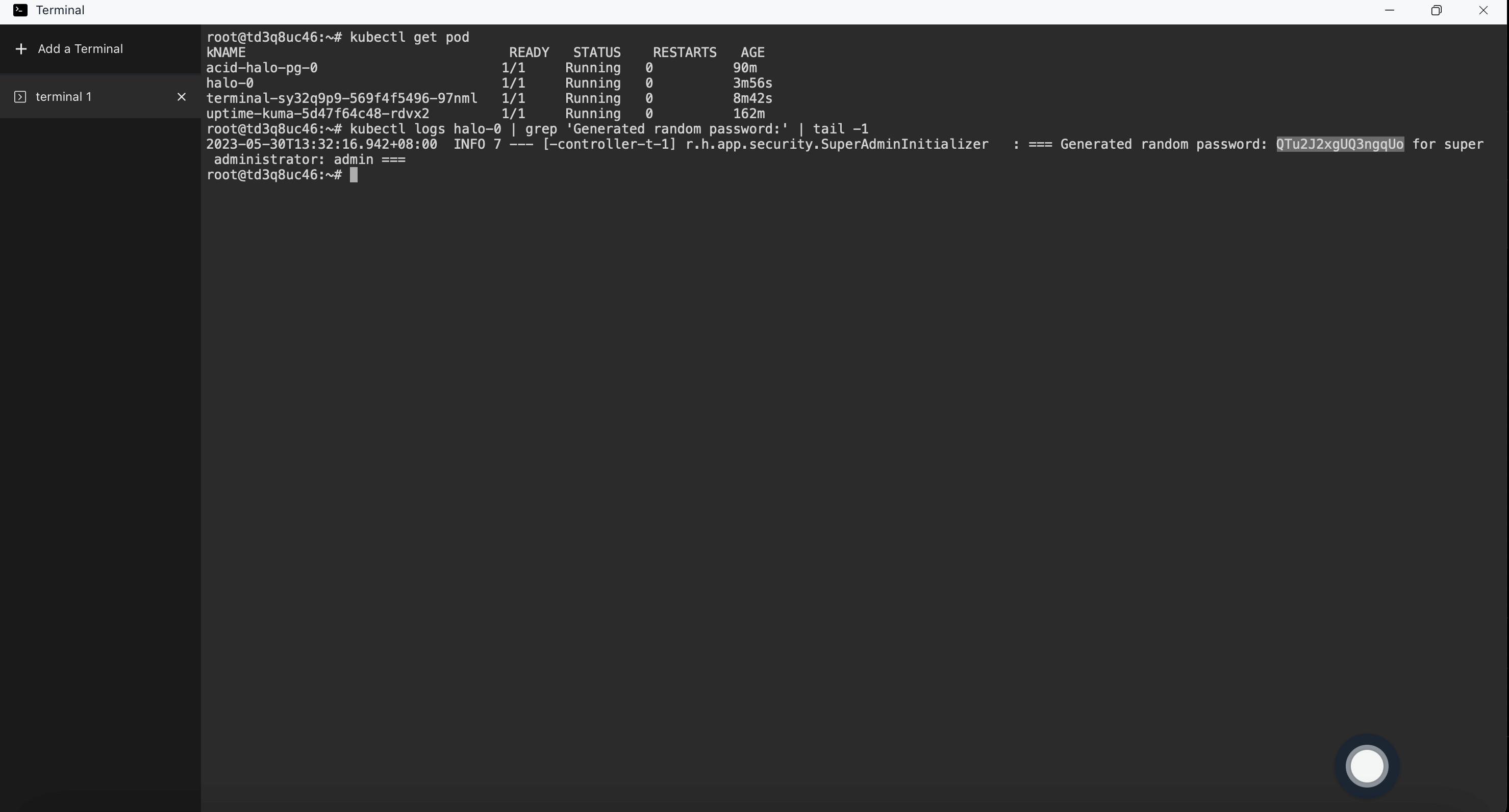 root@td3q8uc46:~# kubectl logs halo-0 | grep 'Generated random password:' | tail -1