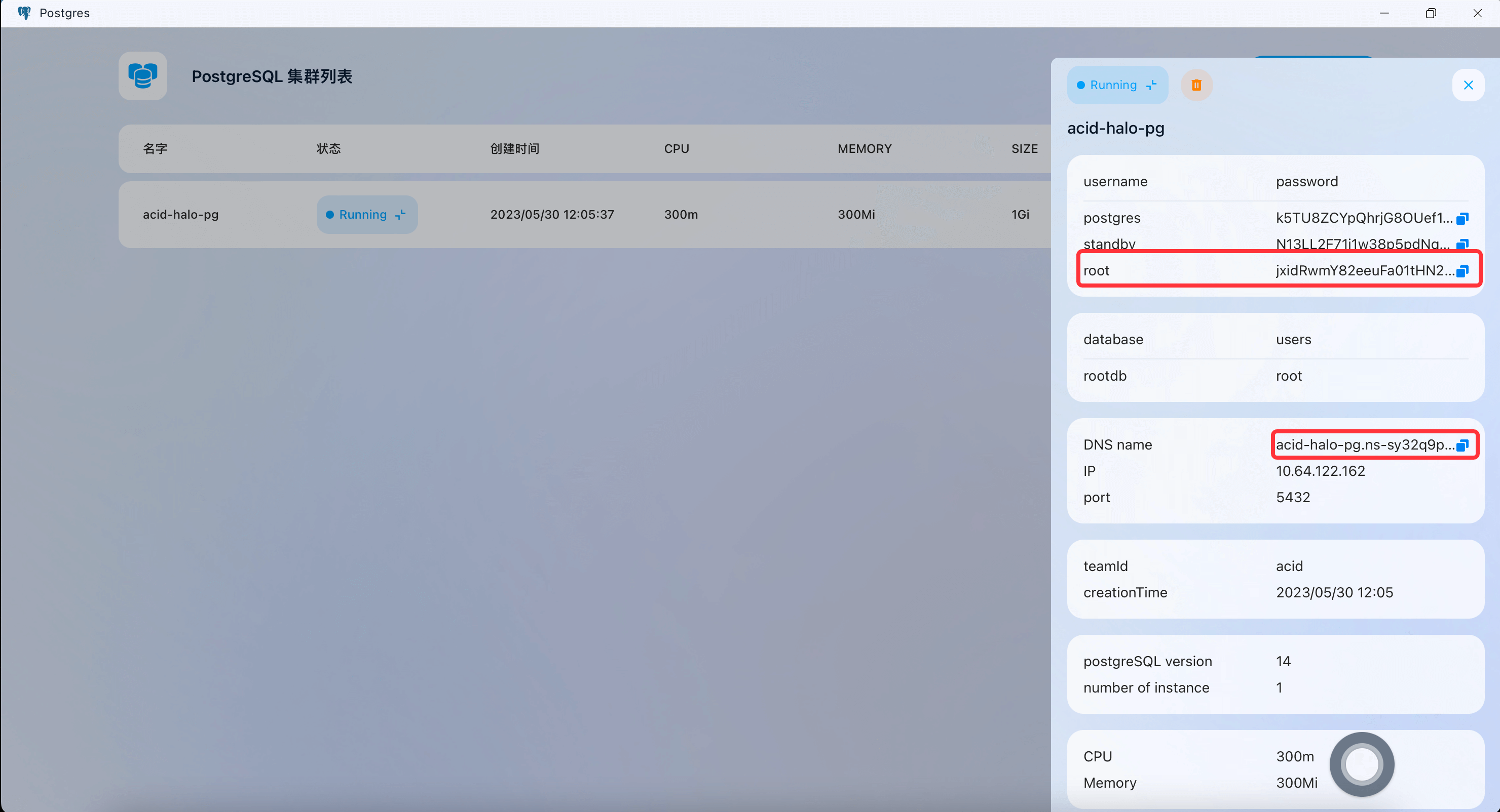 pg DNS name: acid-halo-pg.ns-sy32q9p9.svc.cluster.local:5432