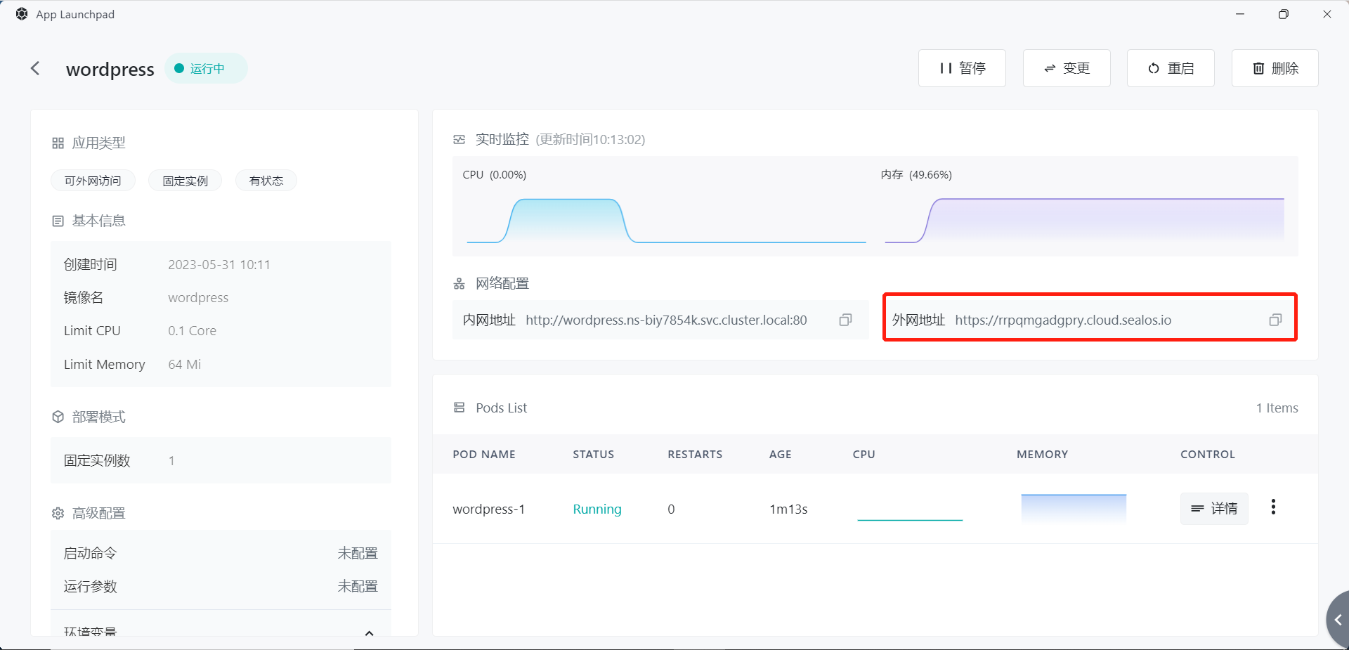 With this, WordPress is also successfully installed. Click on the details, and you can successfully access it through the external network address.