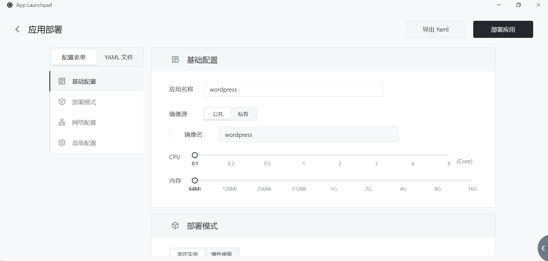 Next, configure CPU and memory resources for WordPress. WordPress is very lightweight, and a small amount of resources is sufficient to ensure the normal operation of the program.