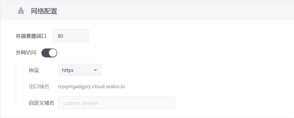 For network configuration, enable external access, and Sealos will automatically assign an exit domain name for users to access from the internet. If the user has already registered their custom domain, they can create a CNAME record pointing to the assigned exit domain name, allowing the custom domain to be used to access the installed application.