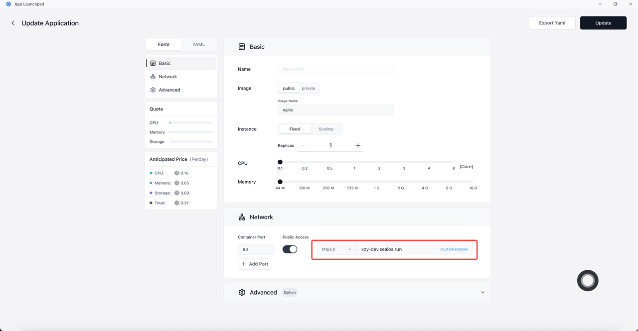 Open "App Launchpad", set a custom domain.