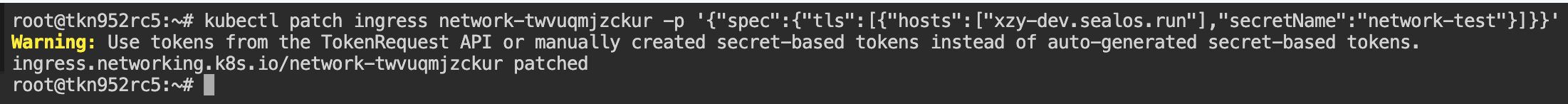 kubectl patch ingress network-twvuqmjzckur -p '{"spec":{"tls":[{"hosts":["xzy-dev.sealos.run"],"secretName":"network-test"}]}}'