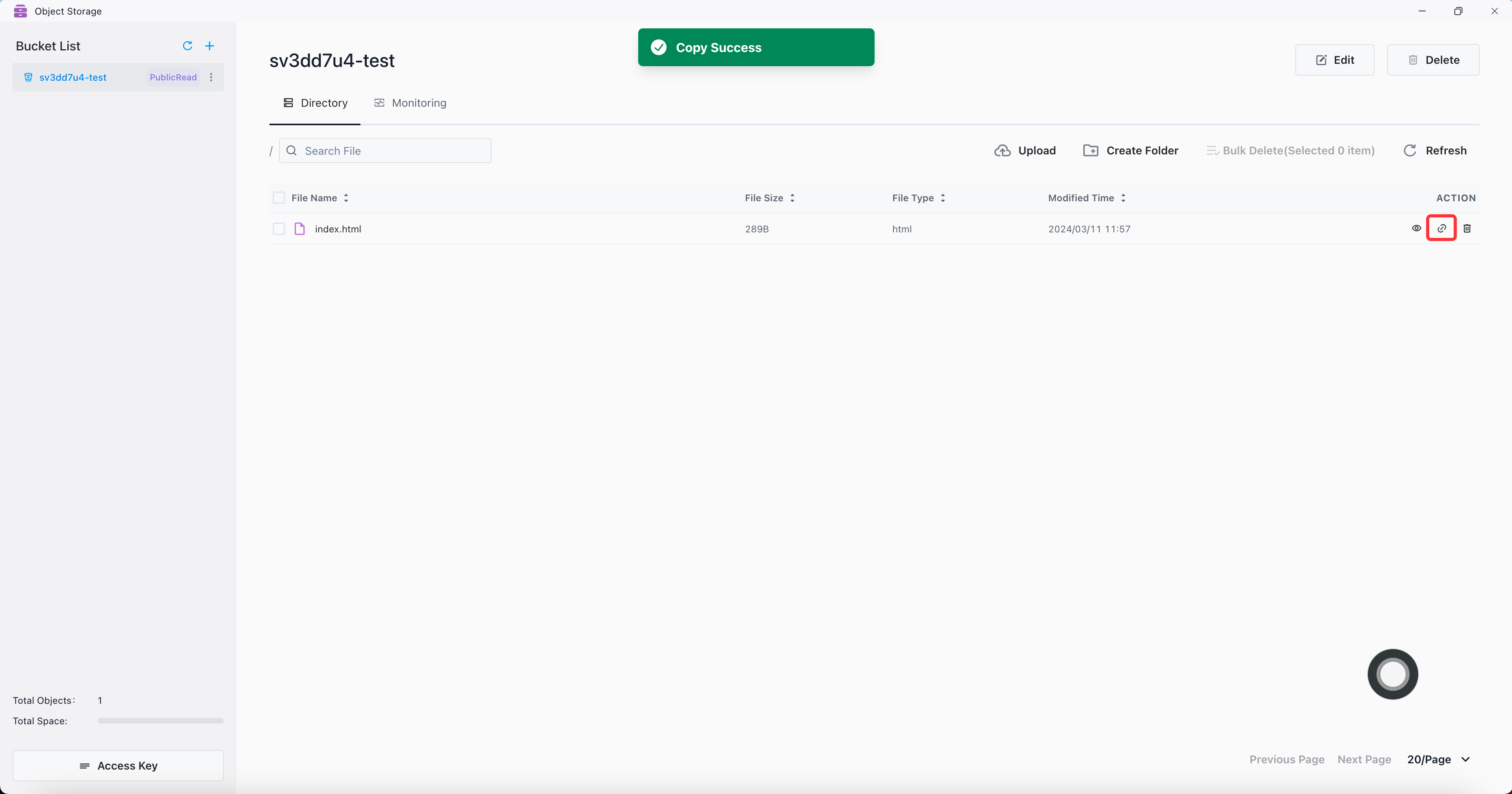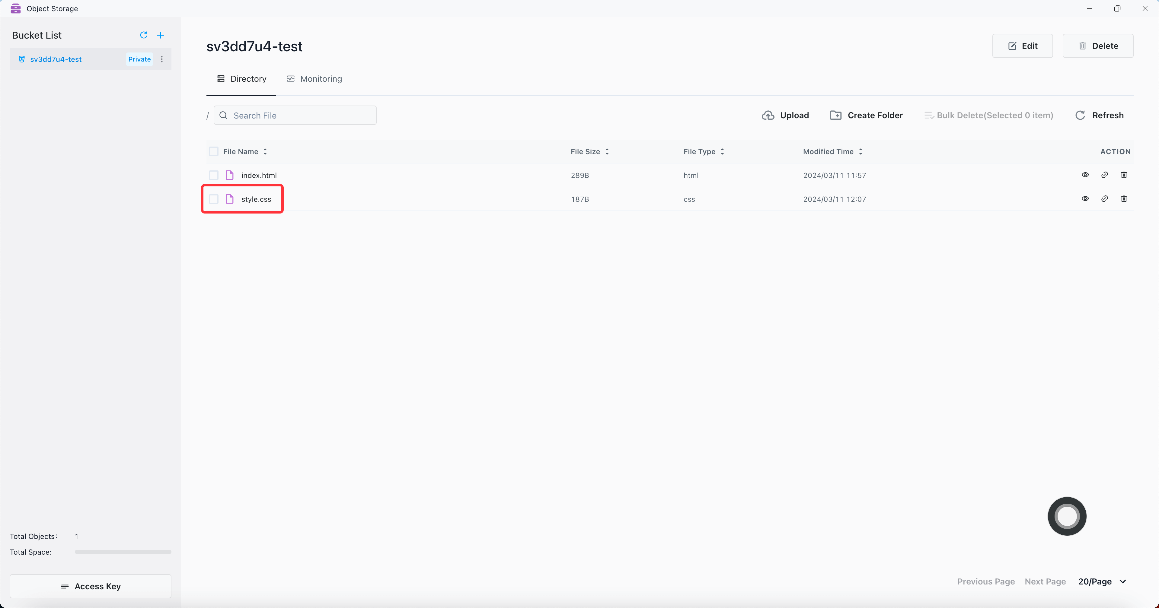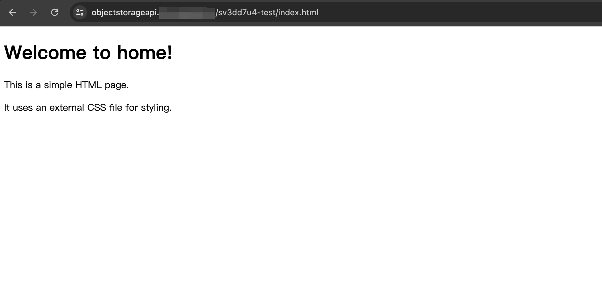 Example: Use the Go Client SDK to upload the style.css file to the sv3dd7u4-test bucket, and set the endpoint to the external address. If the service is deployed in the K8s cluster, you can change the endpoint to the internal address.