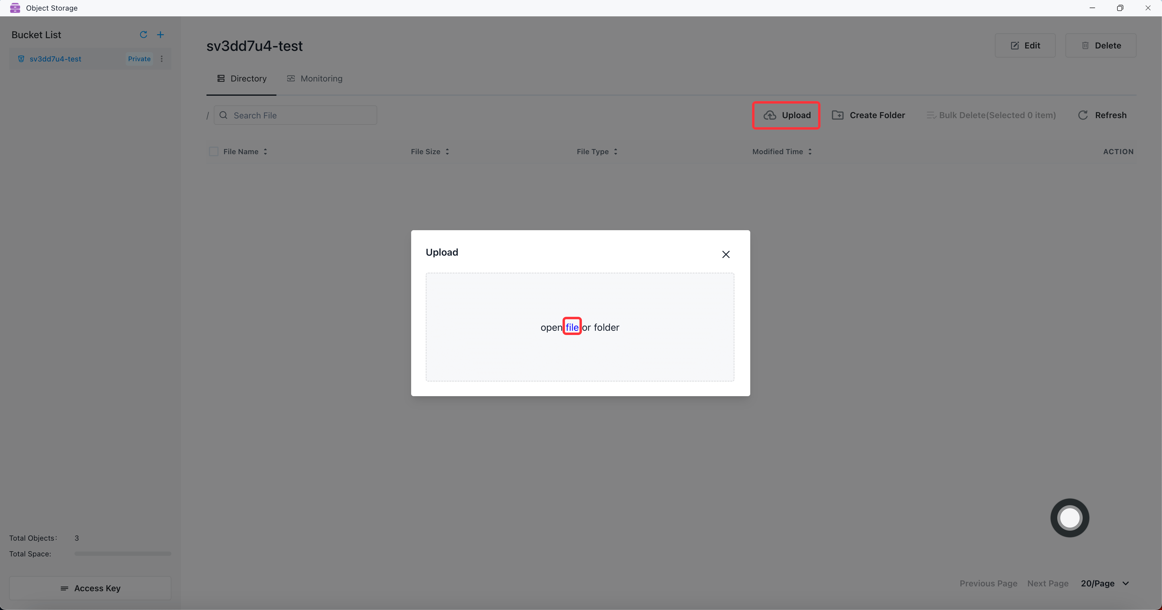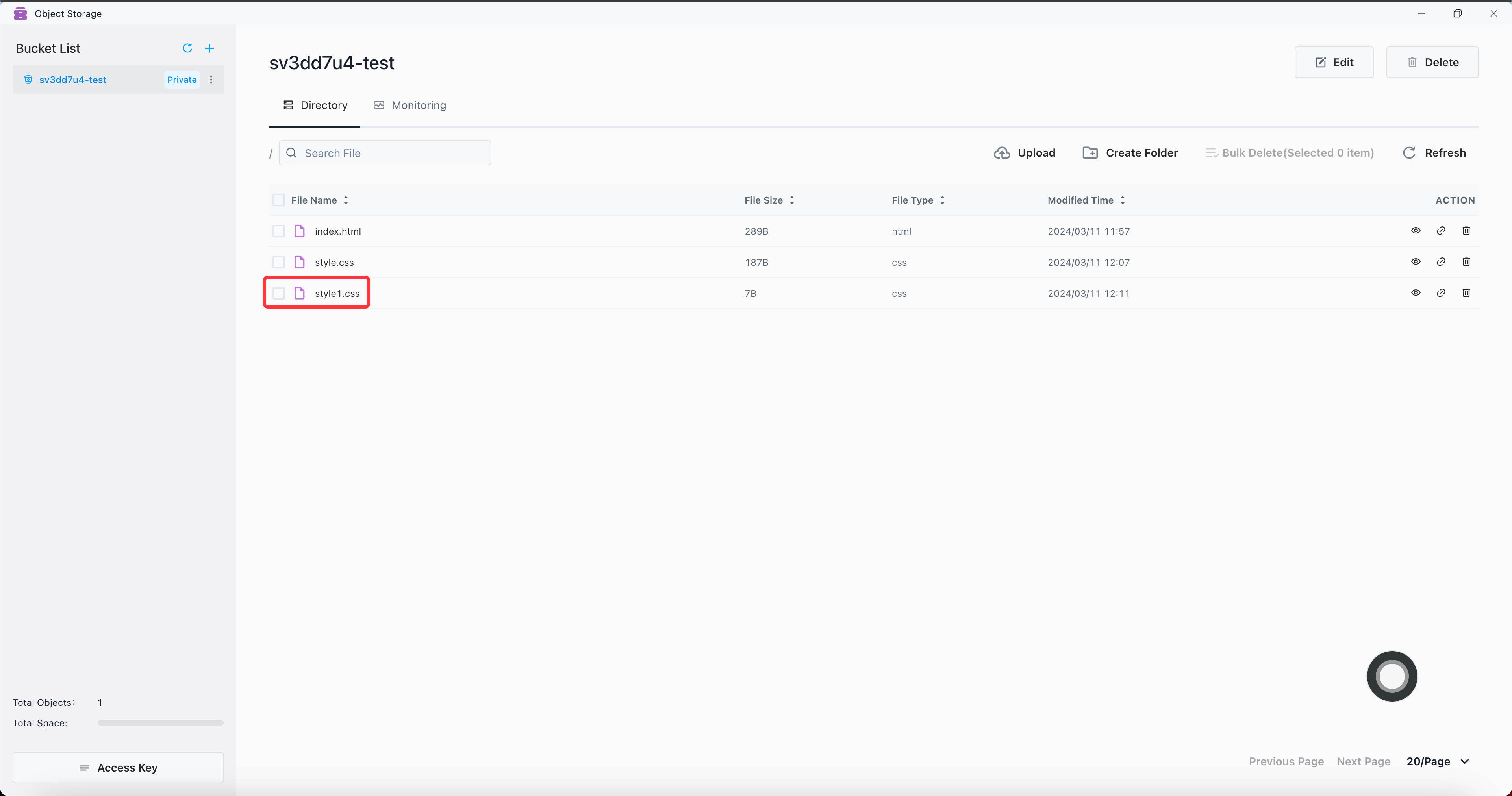 Example: Use the Java Client SDK to upload the style1.css file to the sv3dd7u4-test bucket, and set the endpoint to the external address. If the service is deployed in the K8s cluster, you can change the endpoint to the internal address.