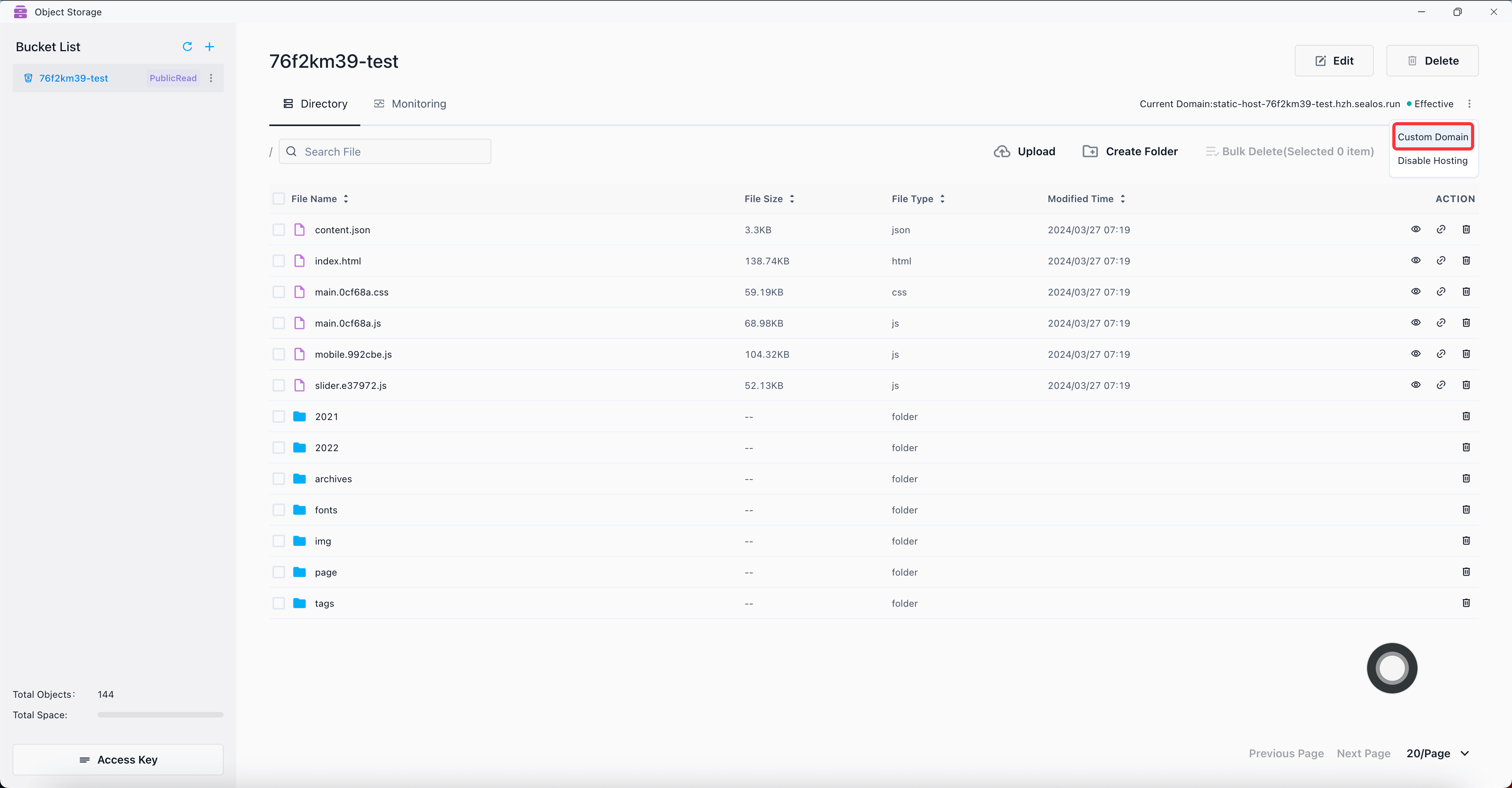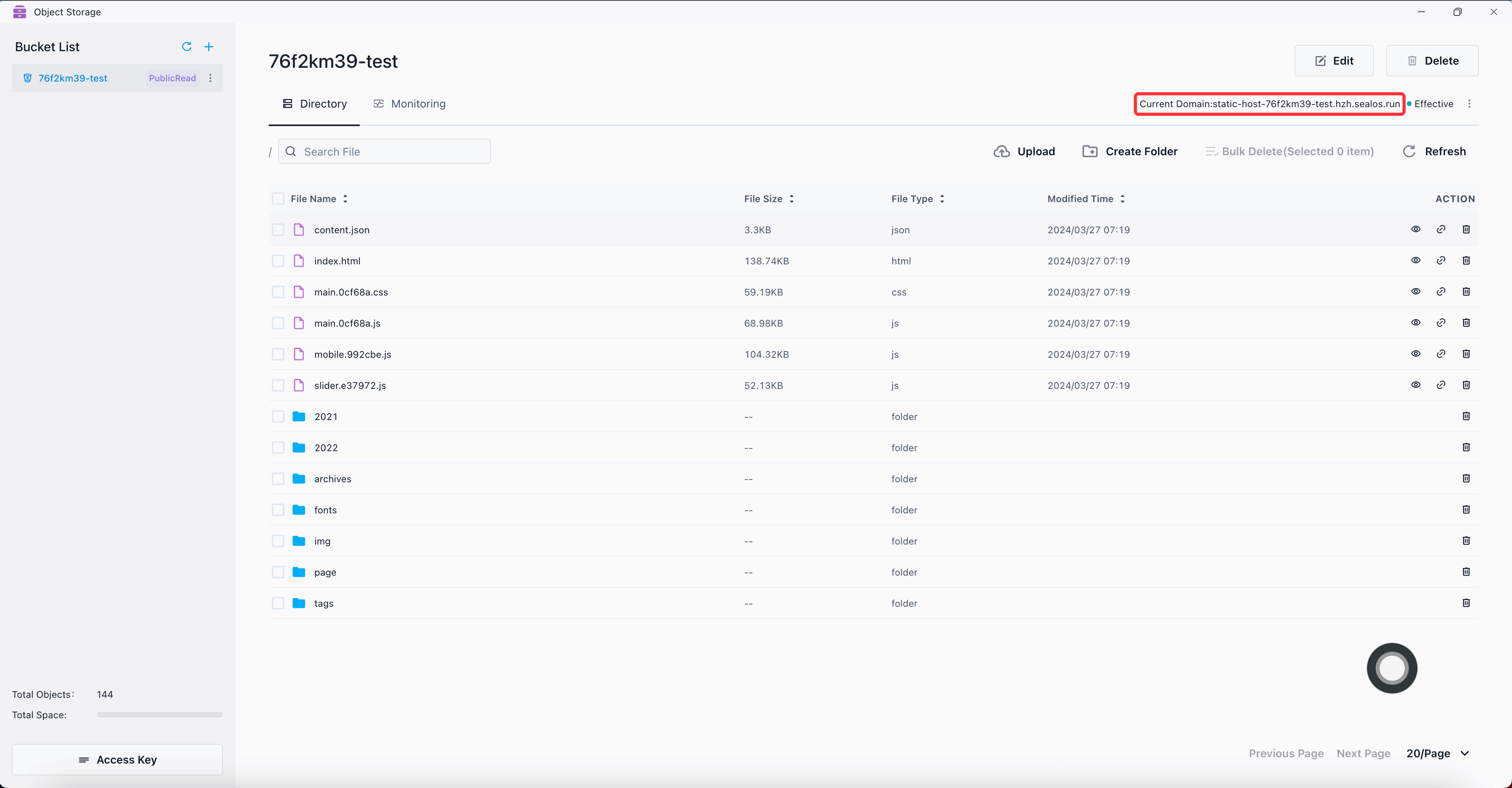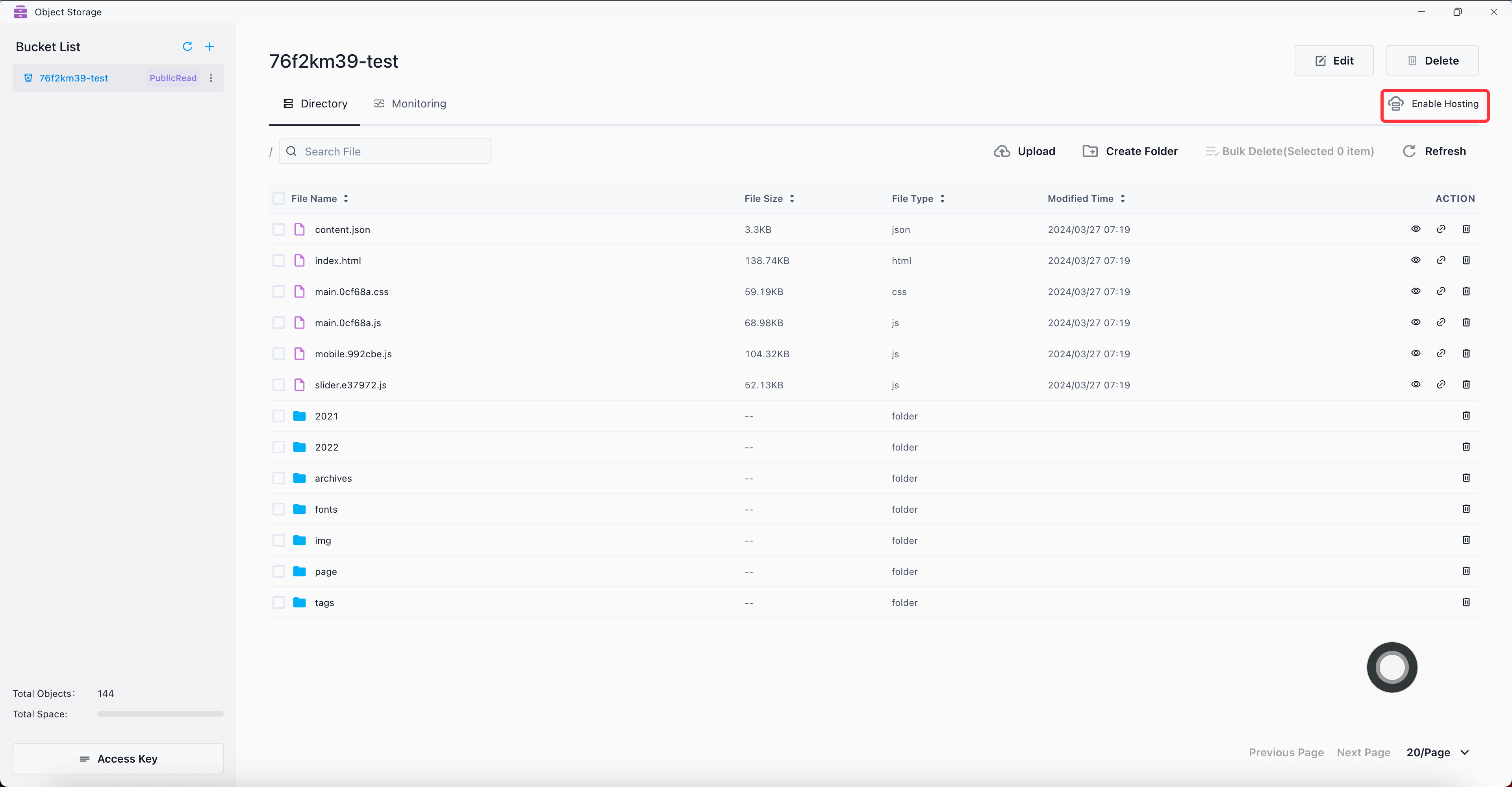 Create a permission for publicRead/publicReadwrite bucket, click Enable Hosting.
