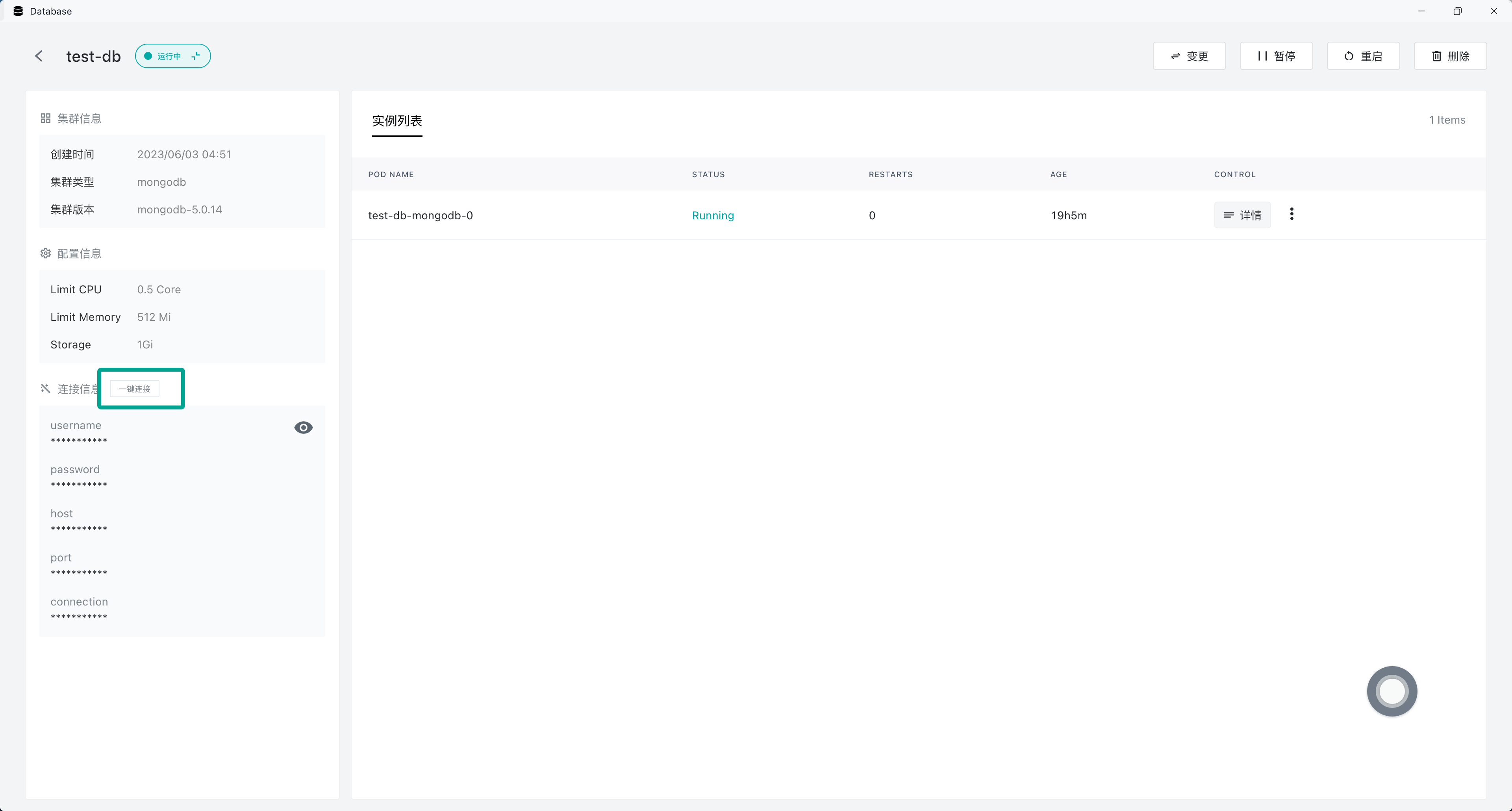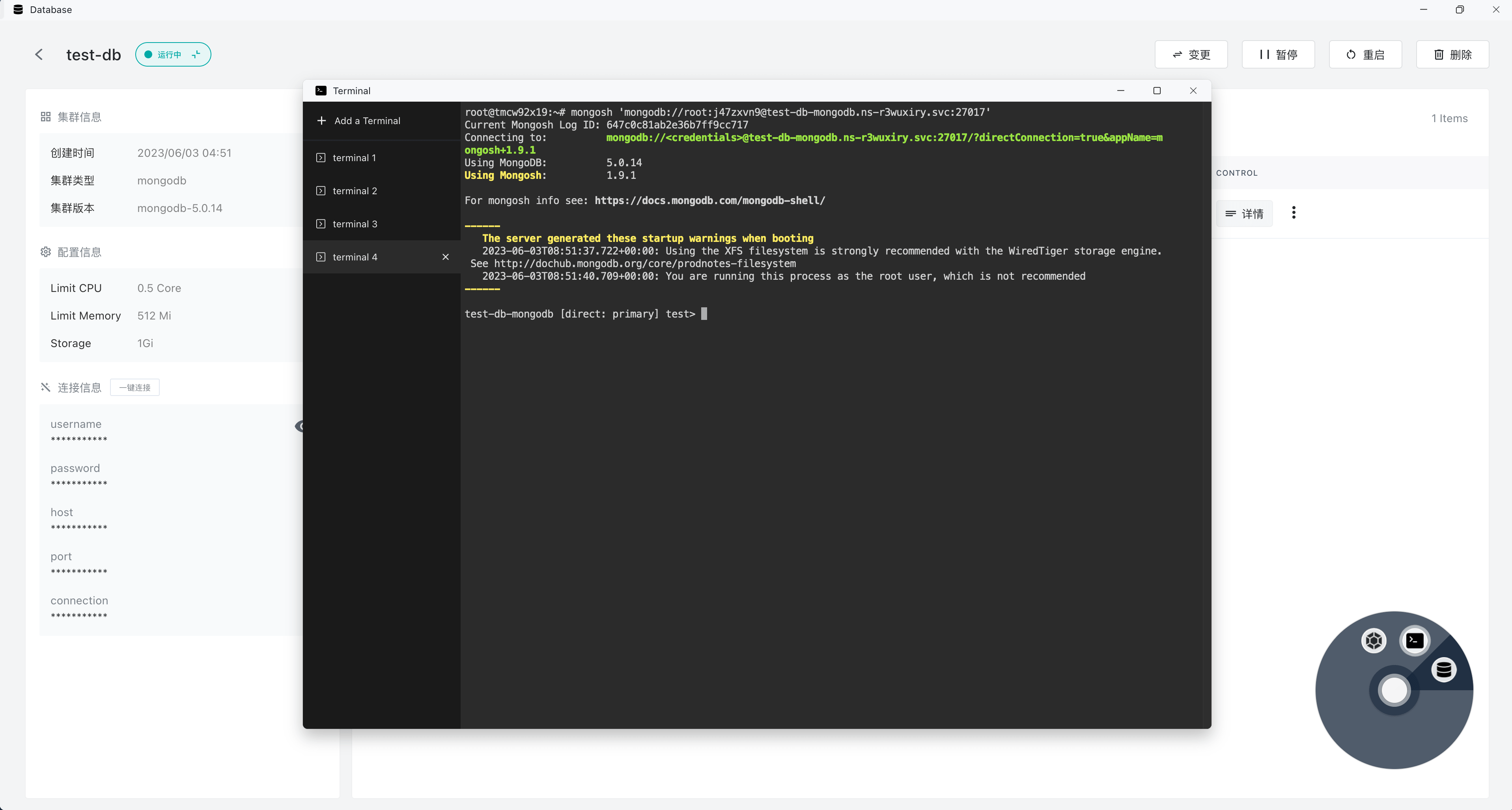 It is also possible to establish a direct connection to the database created in theDatabase App with a single click via the Terminal.