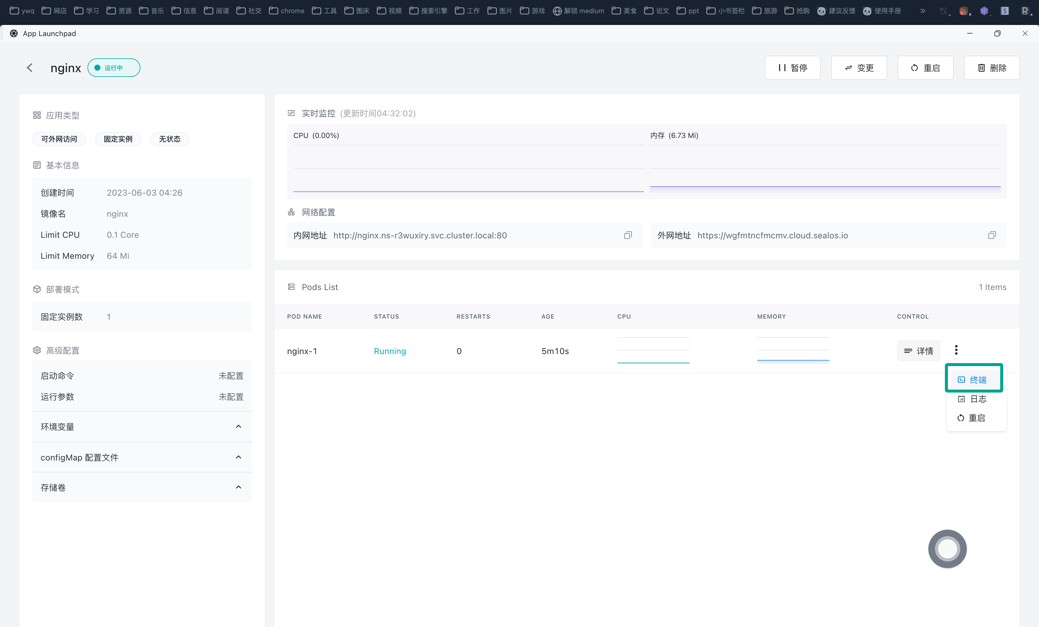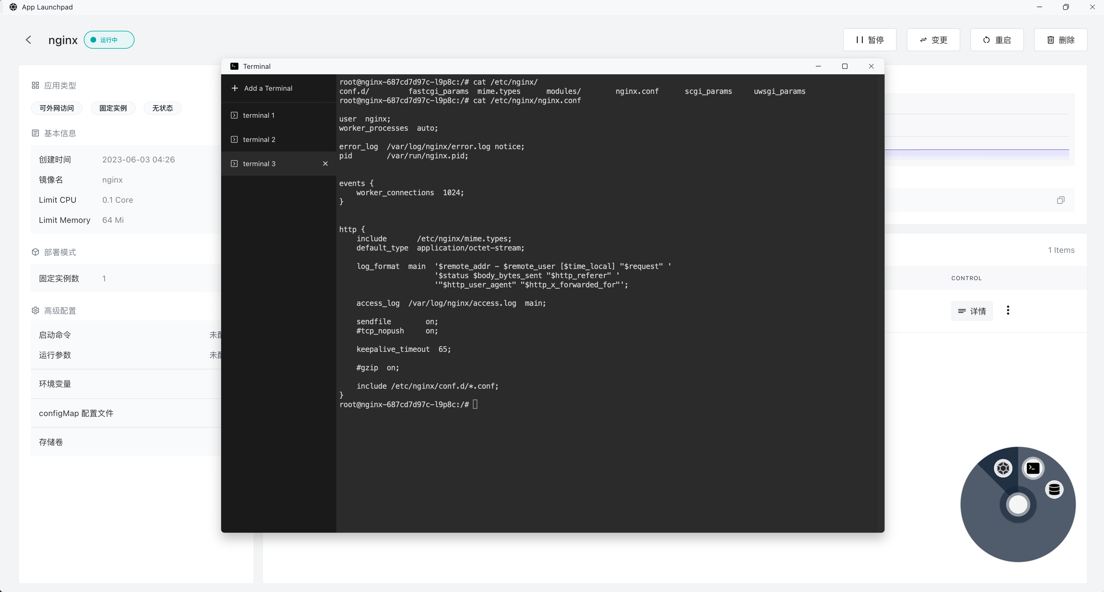 One may directly access the Terminal of any application container via the Terminal App. Suppose you have deployed an application such as Nginx via application management, one can navigate directly to the Nginx application's detail page, click on the three dots on the right side of the details, and then click on 'Terminal' to access the Terminal of the Nginx application.