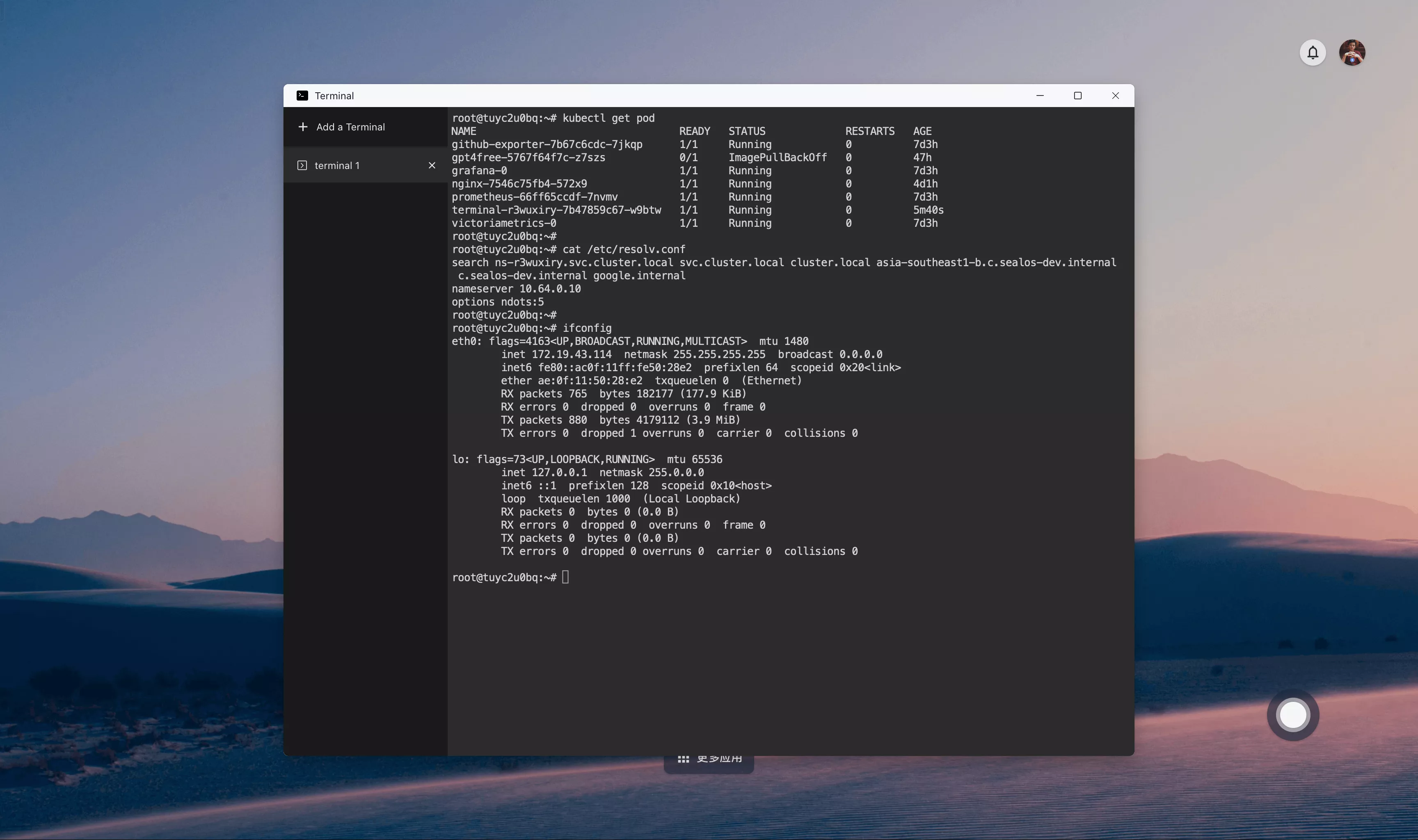 Every user's Terminal is in fact operating within a Pod of Kubernetes, which can be observed in the Terminal using the following command: