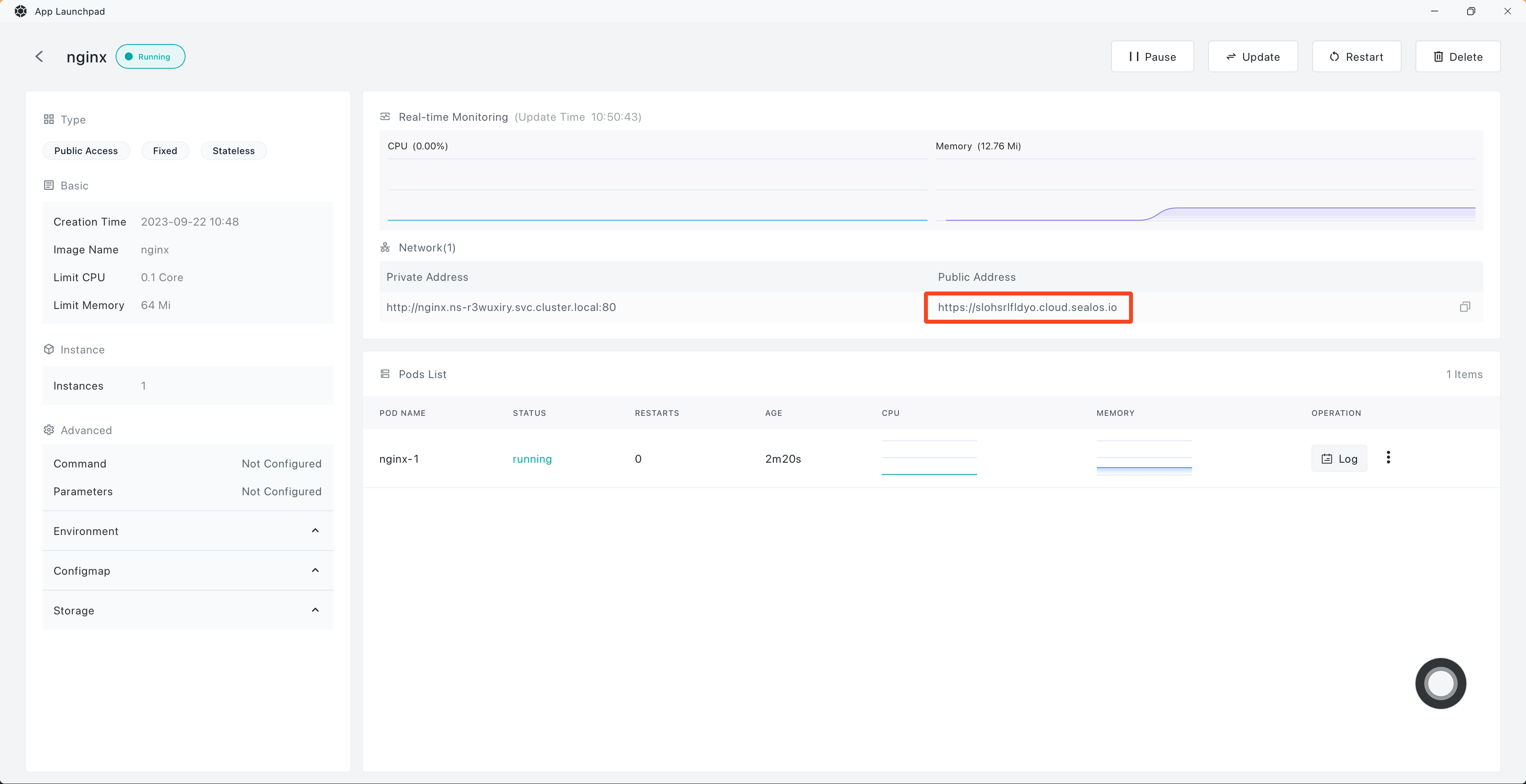 you can view the operational metrics of the Nginx application, including CPU and memory usage. Click on the external link to open the Nginx interface directly via the external domain name.