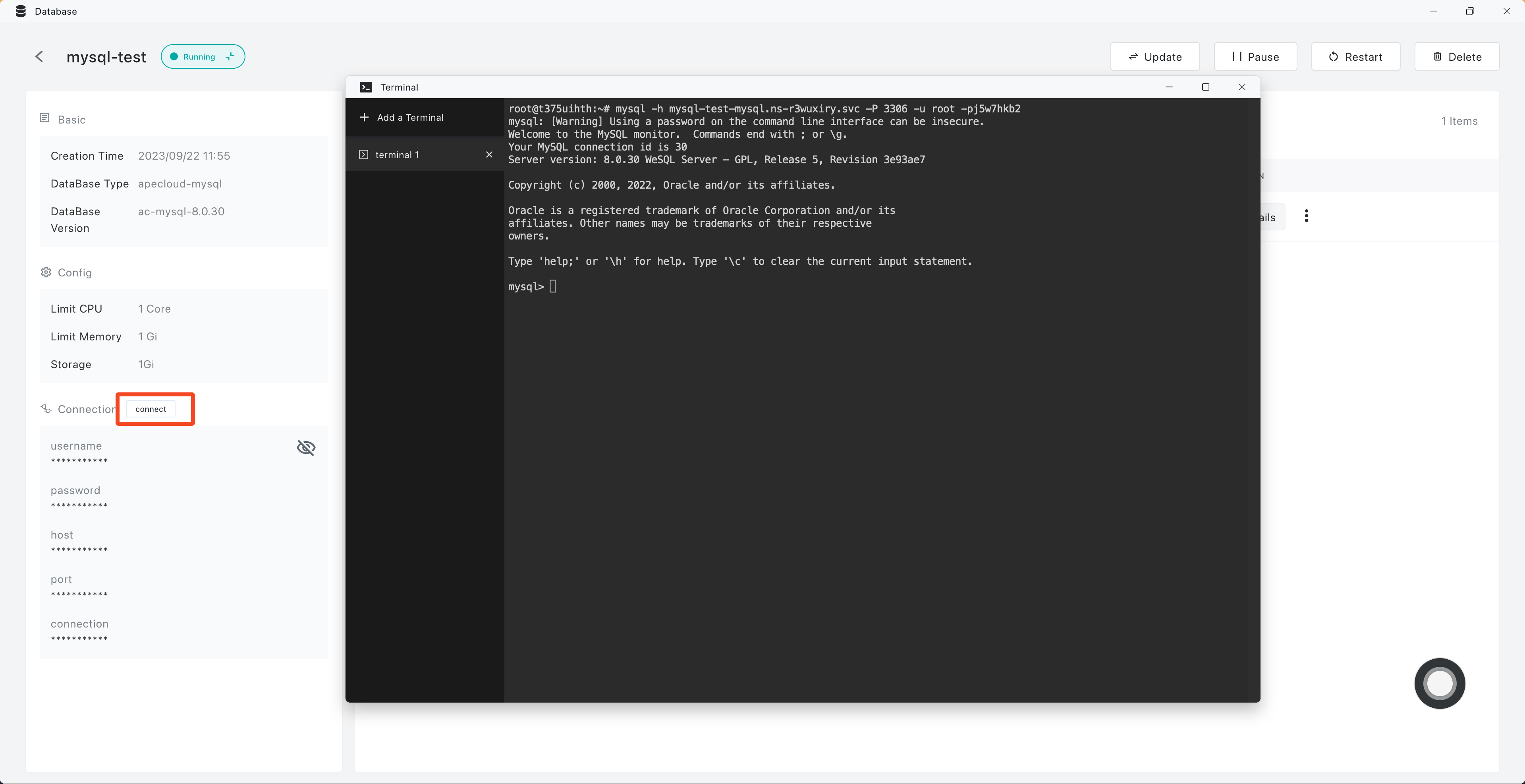 - Click on 'connect', which will directly launch the "Terminal" application, leading you to the database command line.