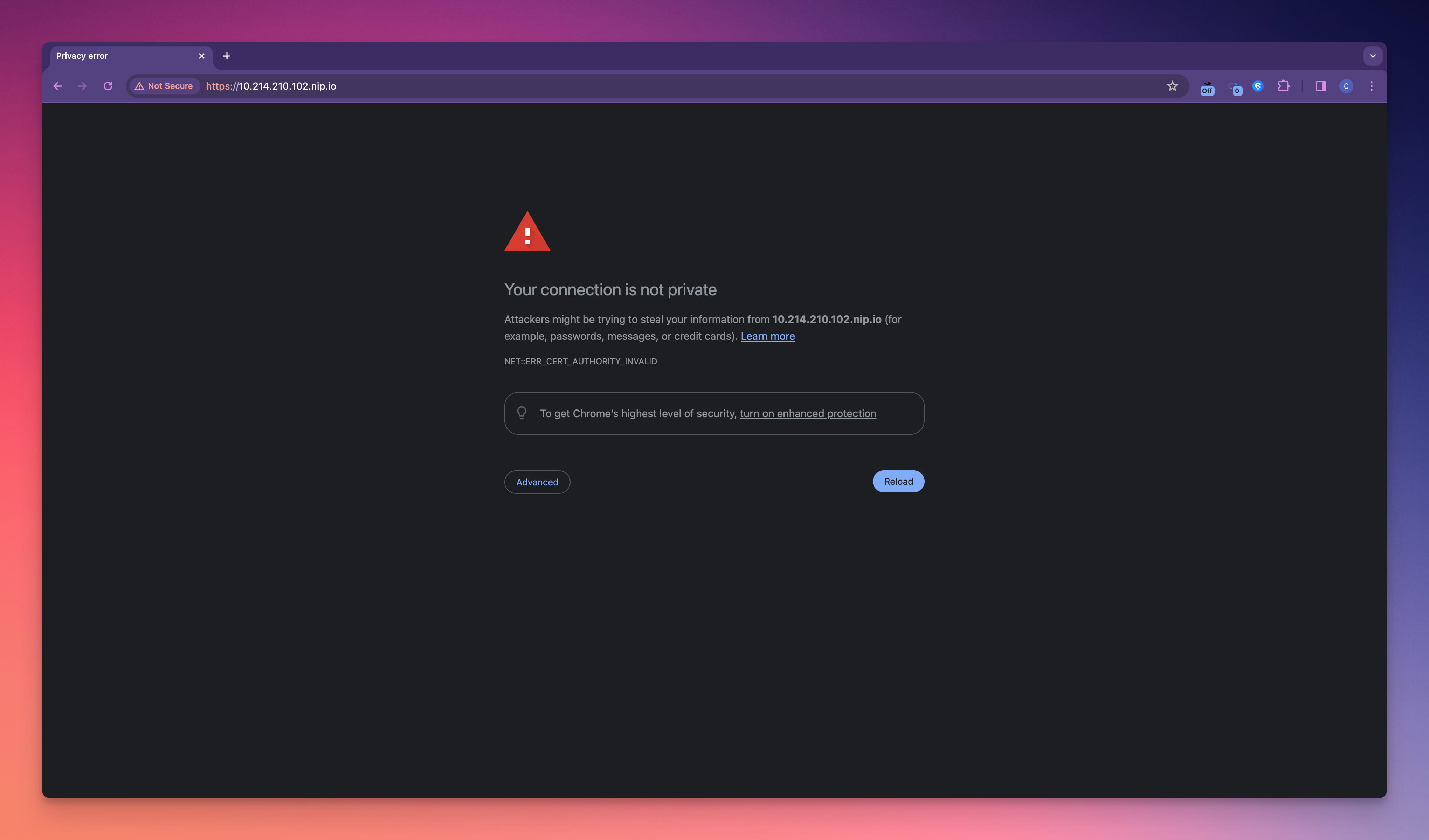 When using installation options 1, 3, or 4, as highlighted earlier, your browser won't automatically recognize and trust your certificate. This leads to a warning message when you try to enter Sealos Cloud: